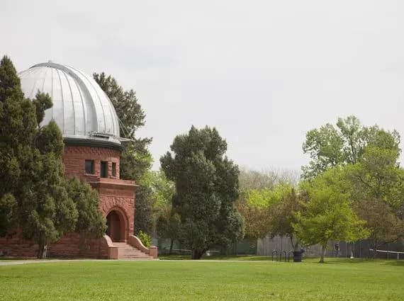 The University of Denver (DU) and Iliff School of Theology were founded downtown in 1864 by John Evans, the 2nd territorial governor of Colorado, but moved to Observatory Park in 1880. Renowned architect Robert Roeschlaub designed University Hall, the school's first building, and Humphrey Baker Chamberlain donated money for the telescope now housed in Romanesque Chamberlain Observatory. The telescope's remarkable 20-inch refractor lens had been displayed at the 1893 Chicago World's Fair.
